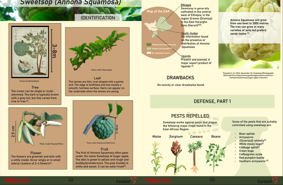To tackle the problem at the core, we found the solution to be healthy soil and land management. We developed a “Soil Health Circle” in which we subdivide agricultural practices under ‘defense’ and ‘nutrition’. These agricultural practices either protect the crops against pests and diseases or to boost the health of the soil. We developed a manual in which we describe specific plants, their geographical location, and their pesticidal and nutritional features. Moreover, these chapters described which pests can be repelled and how to turn the plant into a botanical pesticide. If the plant has nutritional values, we describe the know-hows of the usage, propagation and implementation. This manual also includes a visual pest bibliography, terminology chapter and an overview of all the implicit decisions we have taken, being TU/e students. Further use of the manual is then distributed to Cordaid’s local aid workers in South-Sudan and some regions of Ethiopia where our findings will be put into practice.